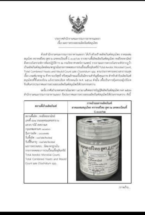 Cục Quản lý Thực phẩm và Dược phẩm Thái Lan vừa công bố một lô dầu hít Hồng Thái, công thức số 2, nhiễm vi sinh vượt chuẩn và yêu cầu người dân ngừng sử dụng.